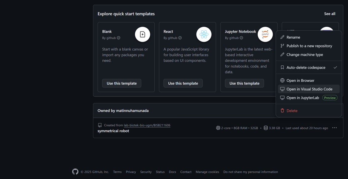 Setelah anda berhasil masuk ke dalam interface codespace, buka terminal dan update repository anda: